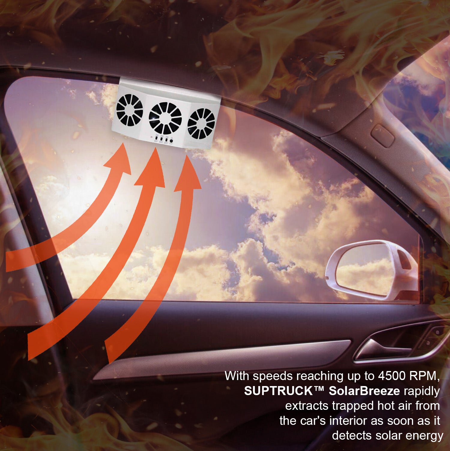 SUPTRUCK⢠SolarBreeze is a solar-powered car window fan designed to reduce interior heat, remove odors, and enhance air circulationāall without draining your vehicleās battery. Equipped with tri-duct ventilation and high-speed turbine motors, it effectively expels trapped hot air and draws in cooler ambient air through natural convection. Powered by adjustable solar panels, this eco-friendly system promotes passive cooling, protects interior materials from heat damage, and helps maintain a fresher, healthier cabin environmentāeven when the engine is off.